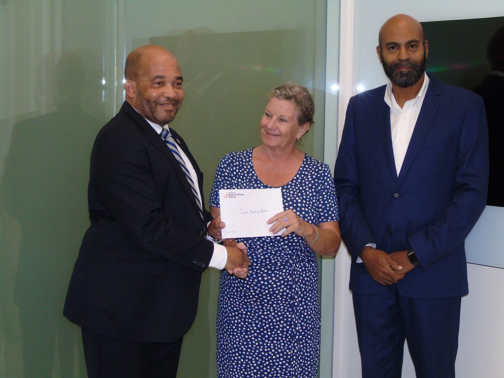 Minister di Finansa señor Kenneth Gijsbertha, na nòmber di Fundashon Wega di number Kòrsou (FWNK), a hasi un donashon na balor di 35000,- florin na Fundashon pa Maneho di adikshon. Señora Meta Fahrenfort, direktor di FMA a risibí e chèk.